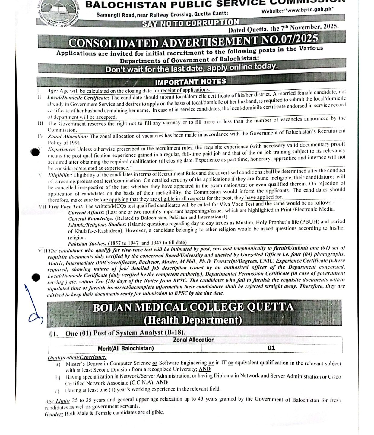 BPSC Jobs 2025, Balochistan Public Service Commission Jobs, BPSC Advertisement 07/2025, Government Jobs in Balochistan, BPSC Online Apply, BPSC Quetta Jobs, BPSC BPS-18 Jobs, BPSC BPS-16 Jobs, Education Department Jobs Balochistan, Health Department Jobs Quetta, Social Welfare Jobs Balochistan, Latest Government Jobs Pakistan 2025, Public Sector Jobs Pakistan, BPSC Teaching Jobs, BPSC System Analyst Job, BPSC Accountant Job, BPSC Deputy Director Education Job, BPSC Literacy Officer Job.